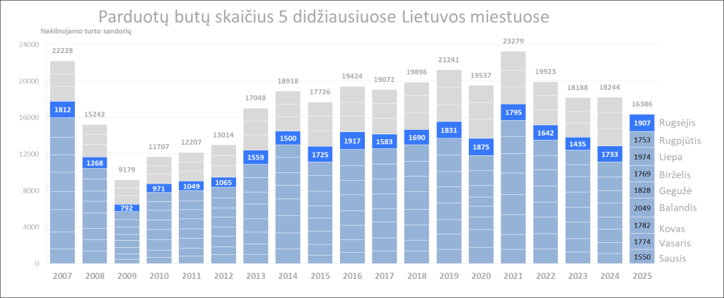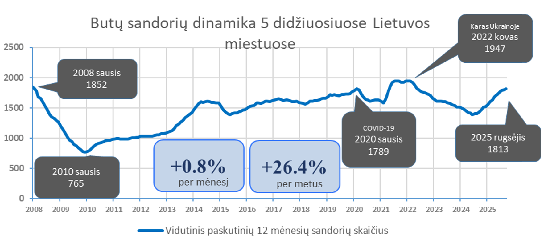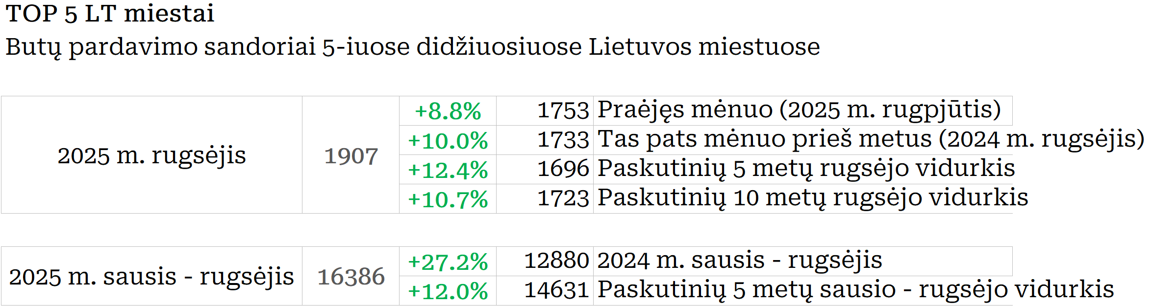 2025 m. rugsėjį penkiuose didžiuosiuose Lietuvos miestuose įregistruota 8,8% daugiau butų pardavimo sandorių nei prieš mėnesį, bei 10,0% daugiau nei 2024 metų rugsėjį. Paskutinių 12 mėnesių sandorių kiekio vidurkis 2025 m. spalio pradžioje didžiuosiuose miestuose siekė 1813. Per mėnesį šis rodiklis augo 0,8%, o per metus +26,4%. Metinė butų sandorių kiekio dinamika didžiuosiuose Lietuvos miestuose: Vilnius +31,6%, Kaunas +20,9%, Klaipėda +19,5%, Šiauliai +27,7%, Panevėžys +15,6%.