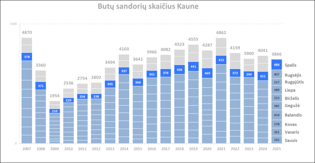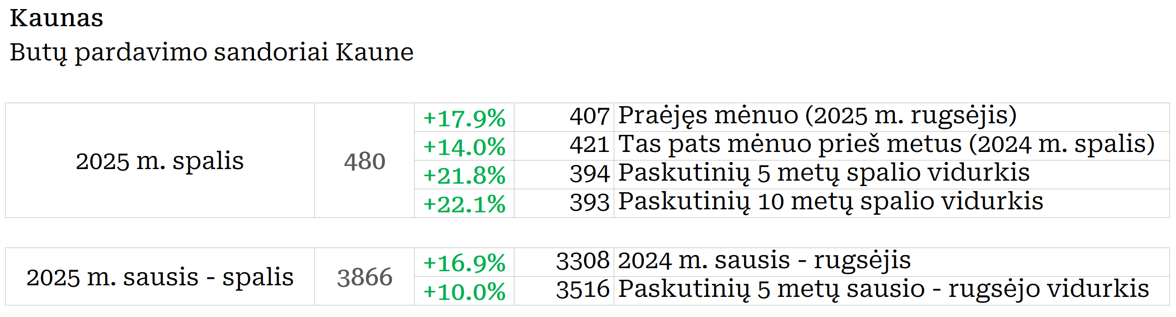 2025 m. spalį Kaune įregistruota 17,9% daugiau butų pardavimo sandorių nei prieš mėnesį, bei 14,0% daugiau nei 2024 metų spalį. Paskutinių 12 mėnesių sandorių kiekio vidurkis 2025 m. lapkričio pradžioje Kaune siekė 383. Per mėnesį šis rodiklis augo 1,3%, o per metus +18,4%. Šių metų spalis Kaune – aktyviausias mėnuo per paskutinius 56 mėnesius. Metinė butų sandorių skaičiaus dinamika kituose Lietuvos miestuose: Vilnius +30,8%, Klaipėda +17,4%, Šiauliai +27,0%, Panevėžys +11,6%.