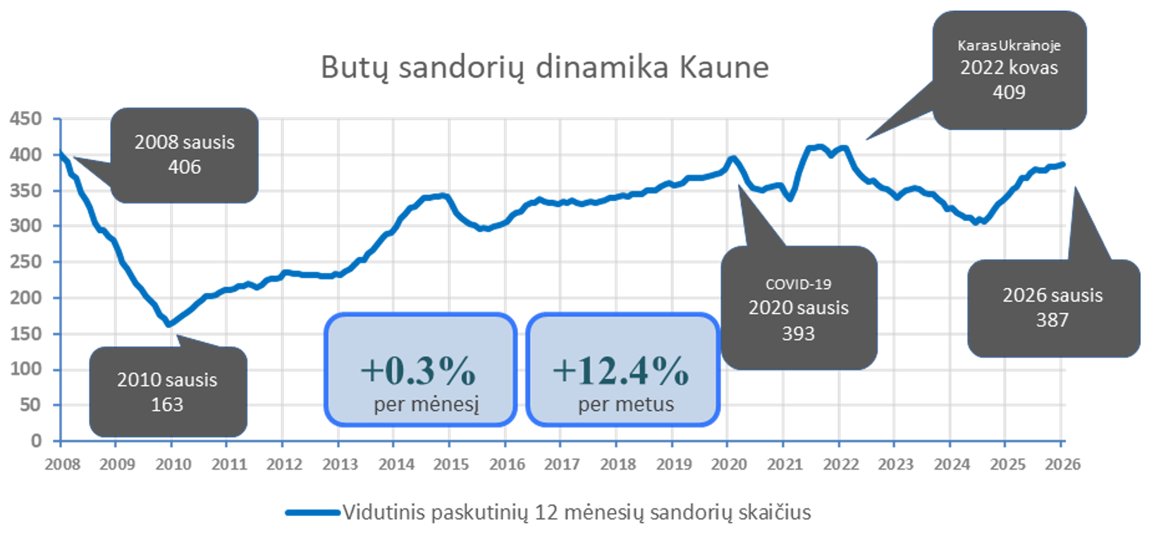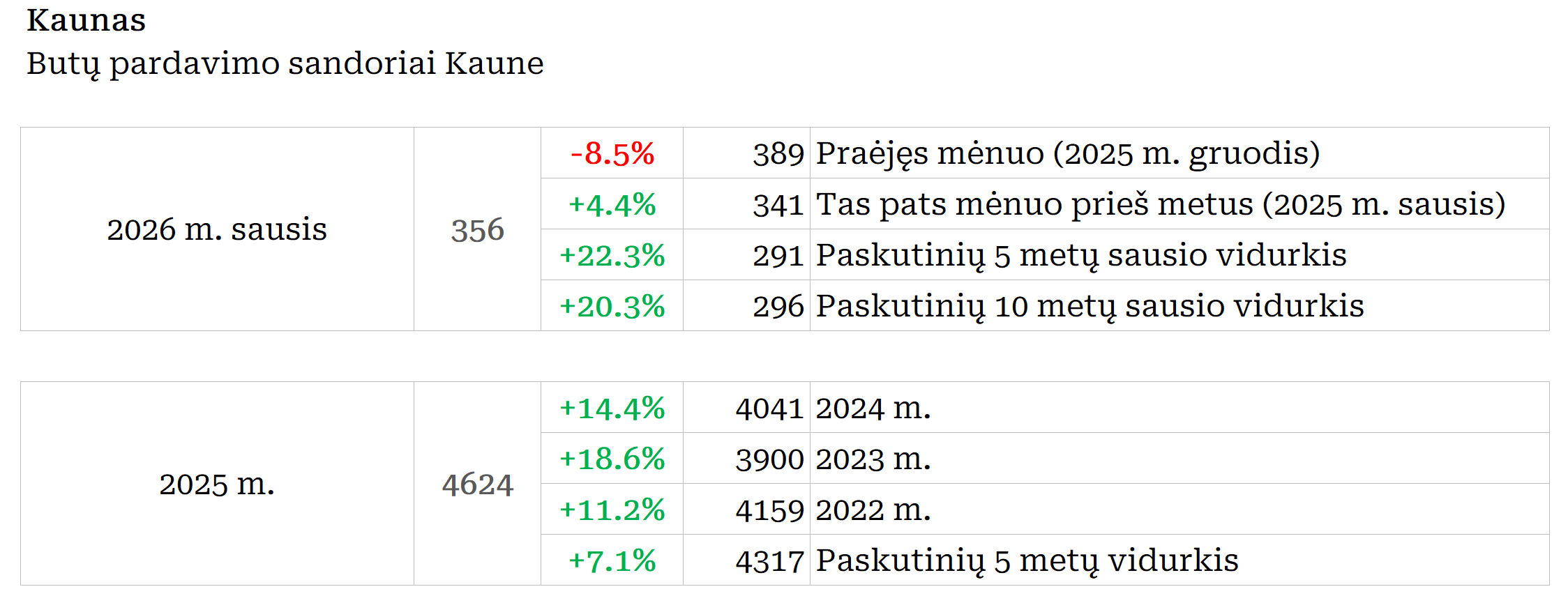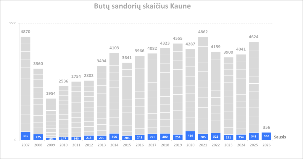 2026 m. sausį Kaune įregistruota 8,5% mažiau butų pardavimo sandorių nei prieš mėnesį, bei 4,4% daugiau nei 2025 metų sausį. Paskutinių 12 mėnesių sandorių kiekio vidurkis 2026 m. vasario pradžioje Kaune siekė 387. Per mėnesį šis rodiklis augo 0,3%, o per metus +12,4%. 2026 metų sausis pagal sandorių skaičių buvo aktyviausias sausis nuo 2020 m. (419 sandorių). Metinė butų sandorių skaičiaus dinamika kituose Lietuvos miestuose: Vilnius +28,3%, Klaipėda +15,8%, Šiauliai +20,4%, Panevėžys +9,2%.