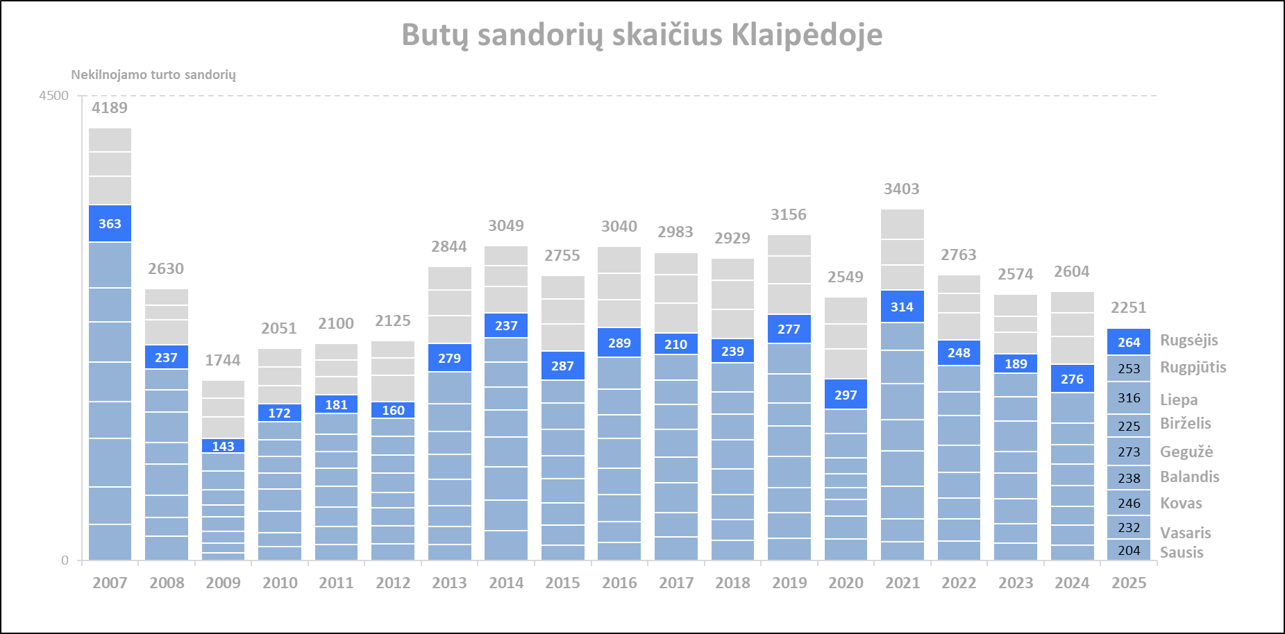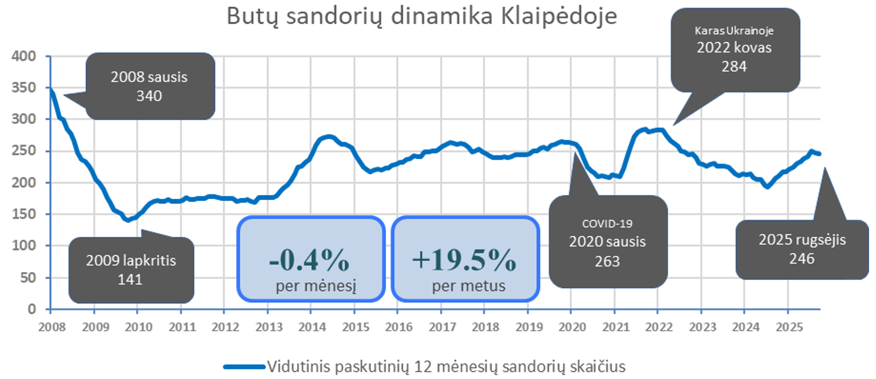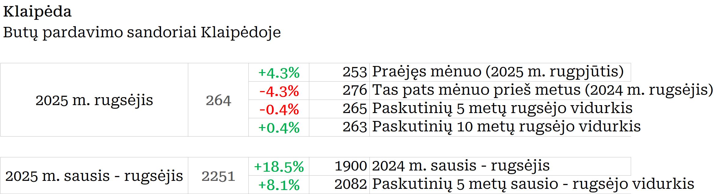 2025 m. rugsėjį Klaipėdoje įregistruota 4,3% daugiau butų pardavimo sandorių nei prieš mėnesį, bei 4.3% mažiau nei 2024 metų rugsėjį. Paskutinių 12 mėnesių sandorių kiekio vidurkis 2025 m. spalio pradžioje Klaipėdoje siekė 246. Per mėnesį šis rodiklis mažėjo 0.4%, o per metus augo 19,5%. Šių metų rugsėjo aktyvumas atitinka ilgamečius rugsėjo vidurkius. Metinė butų sandorių skaičiaus dinamika kituose Lietuvos miestuose: Vilnius +31,6%, Kaunas +20,9%, Šiauliai +27,7%, Panevėžys +15,6%.