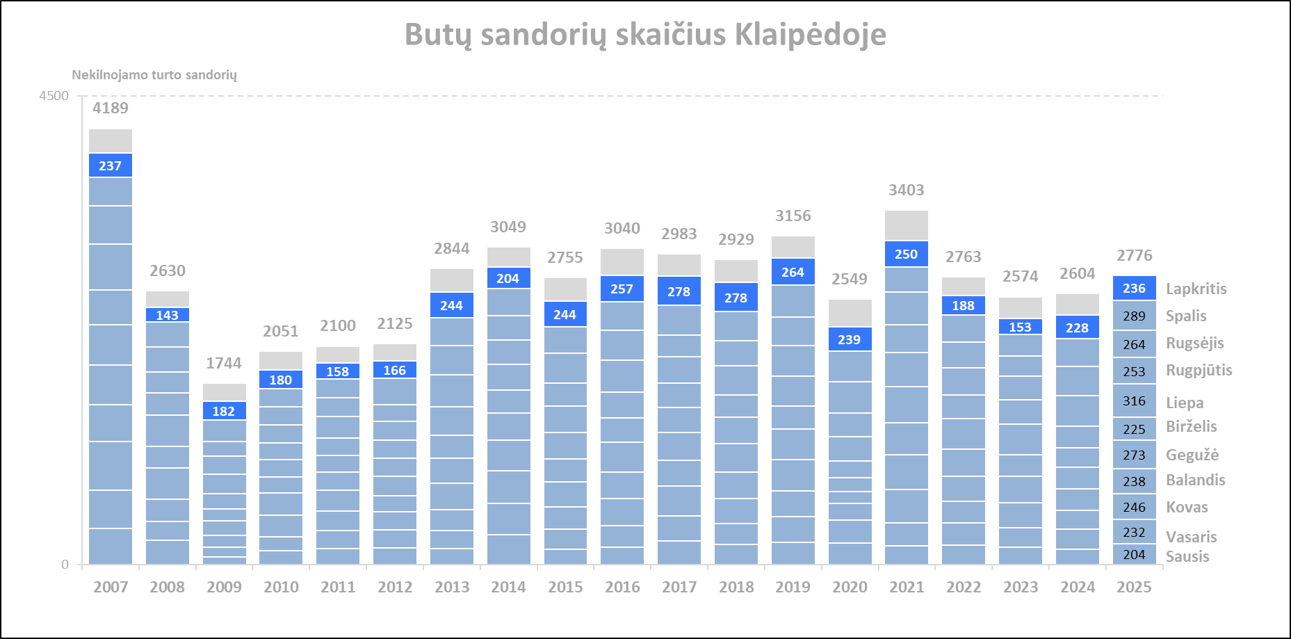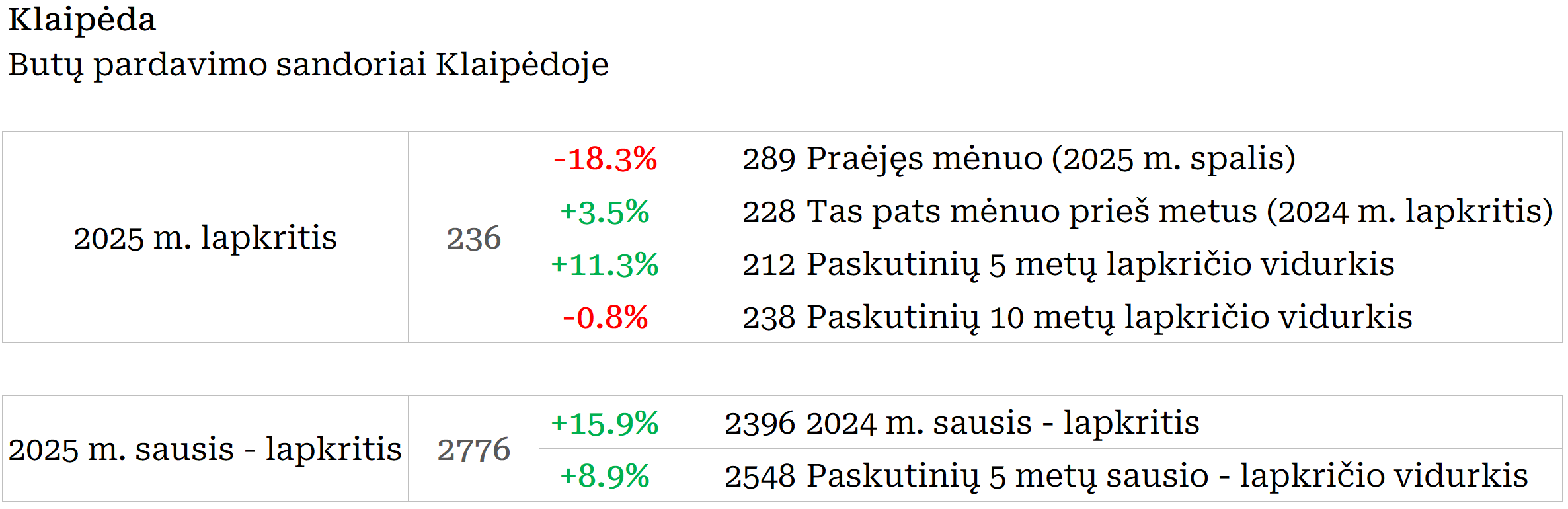 2025 m. lapkritį Klaipėdoje įregistruota 18,3% mažiau butų pardavimo sandorių nei prieš mėnesį, bei 3.5% daugiau nei 2024 metų lapkritį. Paskutinių 12 mėnesių sandorių kiekio vidurkis 2025 m. gruodžio pradžioje Klaipėdoje siekė 249. Per mėnesį šis rodiklis augo 0.3%, o per metus +14,4%. Šių metų lapkritis pagal sandorių skaičių Klaipėdoje atspindi paskutinių 10 metų lapkričio mėnesių vidurkį. Metinė butų sandorių skaičiaus dinamika kituose Lietuvos miestuose: Vilnius +27,8%, Kaunas +15,6%, Šiauliai +22,3%, Panevėžys +9,6%.