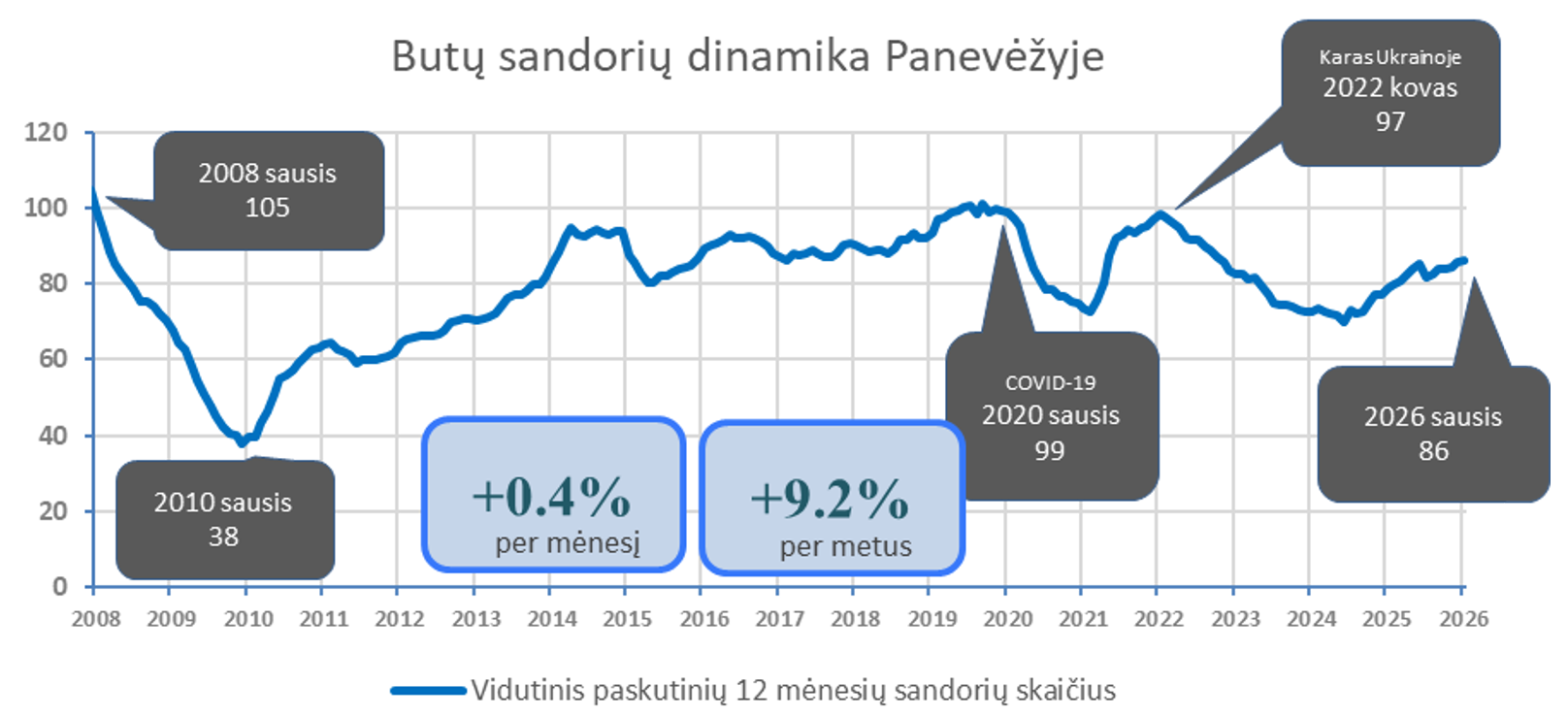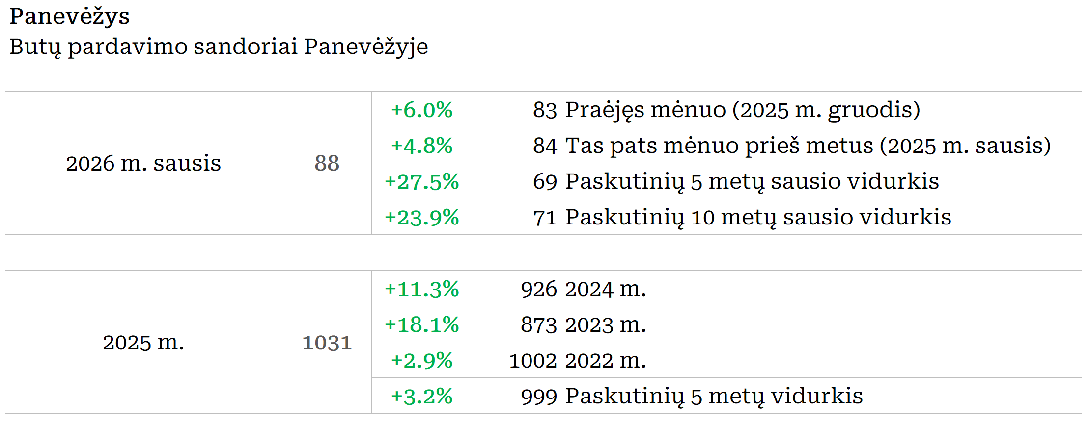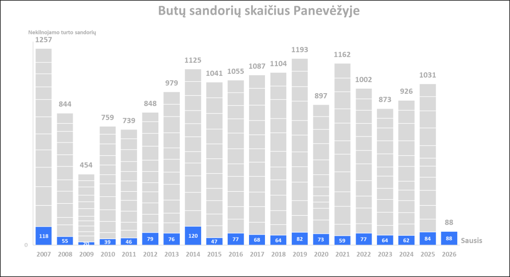 2026 m. sausį Panevėžyje įregistruota 6,0% daugiau butų pardavimo sandorių nei prieš mėnesį, bei 4,8% daugiau nei 2025 metų sausį. Paskutinių 12 mėnesių sandorių kiekio mėnesinis vidurkis 2026 m. vasario pradžioje Panevėžyje siekė 86. Per mėnesį šis rodiklis augo 0,4%, o per metus +9,2%. 2026 metų sausis pagal sandorių skaičių Panevėžyje buvo aktyviausias sausis per pastaruosius 12 metų (2014 m. sausį – 120 sandorių). Metinė butų sandorių kiekio dinamika kituose Lietuvos miestuose: Vilnius +28,3%, Kaunas +12,4%, Klaipėda +15,8%, Šiauliai +20,4%.