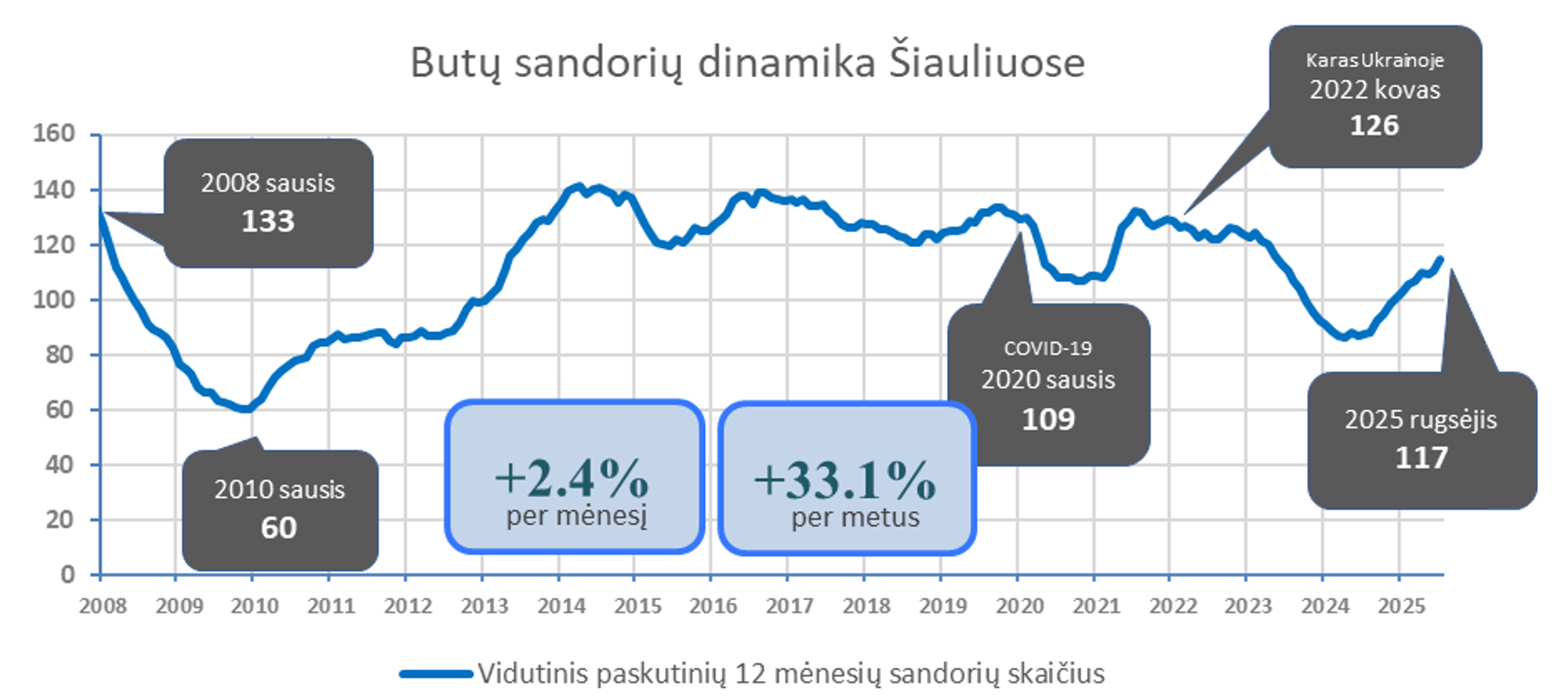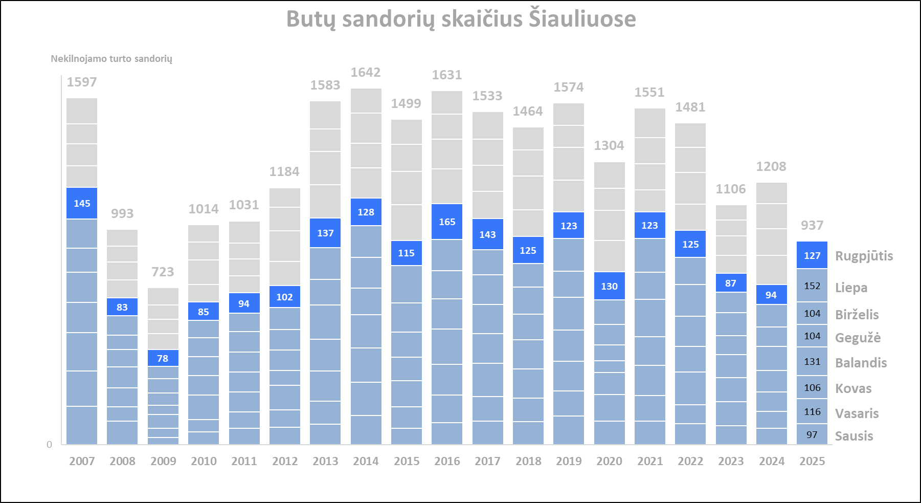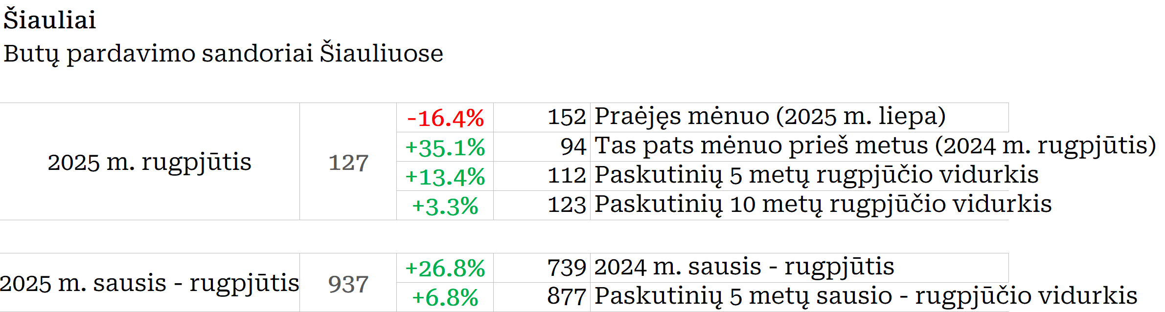 2025 m. rugpjūtį Šiauliuose įregistruota 16,7% mažiau butų pardavimo sandorių nei prieš mėnesį, bei 35,1% daugiau nei 2024 metų rugpjūtį. Paskutinių 12 mėnesių sandorių kiekio mėnesio vidurkis 2025 m. rugsėjo pradžioje Šiauliuose siekė 117. Per mėnesį šis rodiklis ūgtelėjo 2,4%, o per metus 33,1%. Metinė butų sandorių skaičiaus dinamika kituose Lietuvos miestuose: Vilnius +31,8%, Kaunas +23,1%, Klaipėda +24,4%, Panevėžys +14,6%.