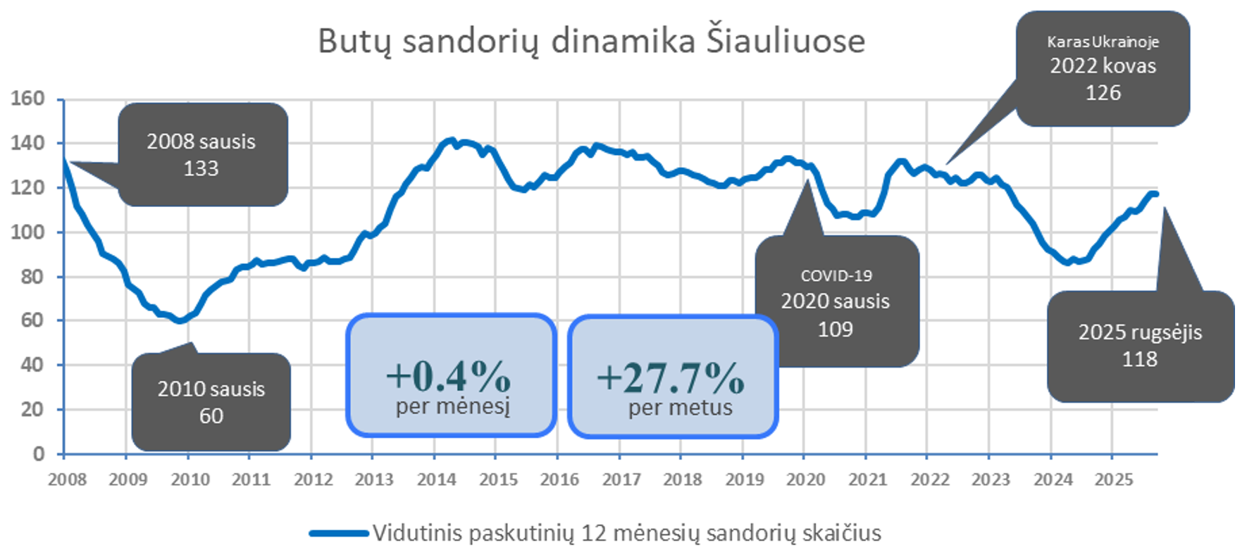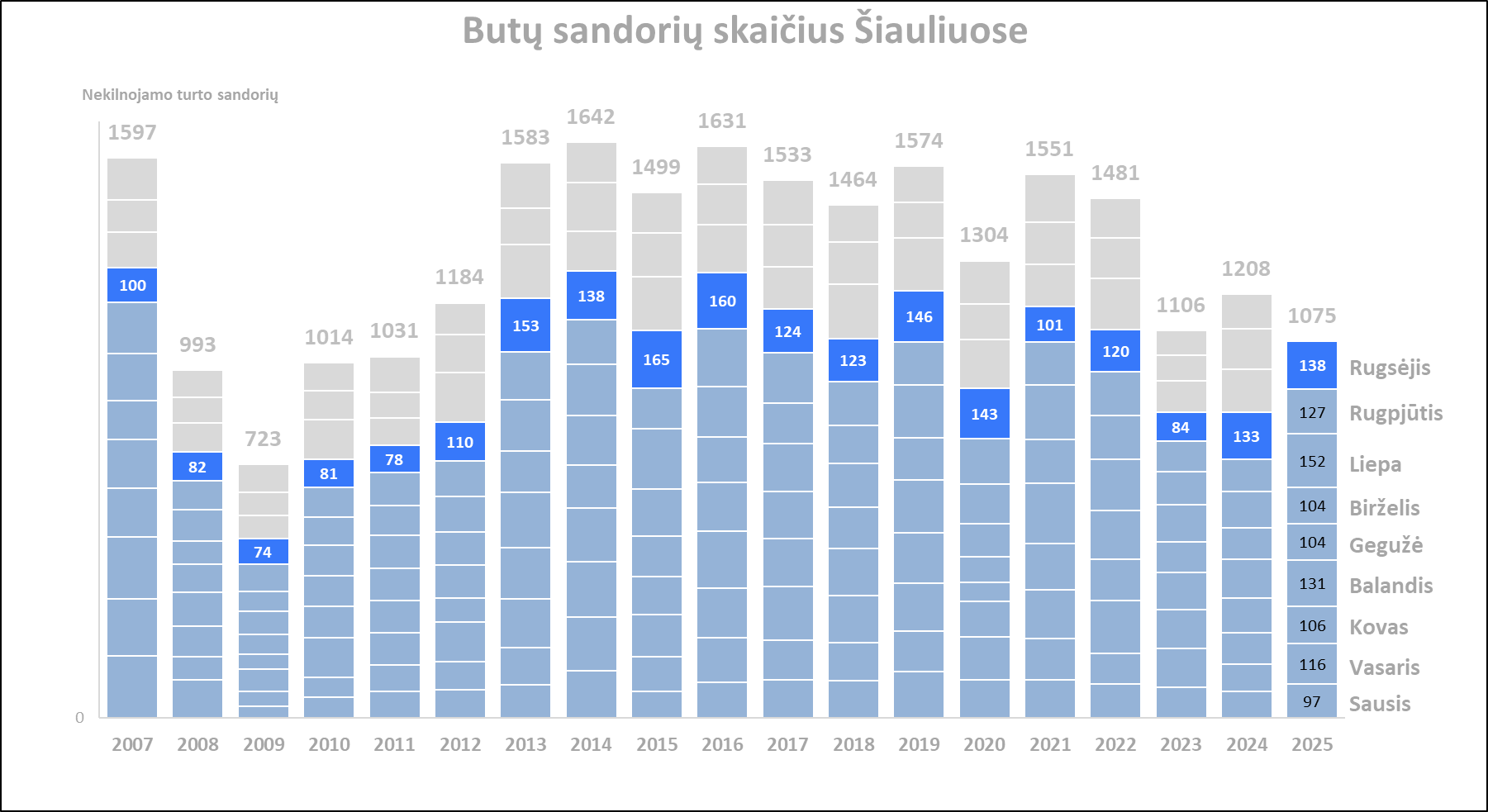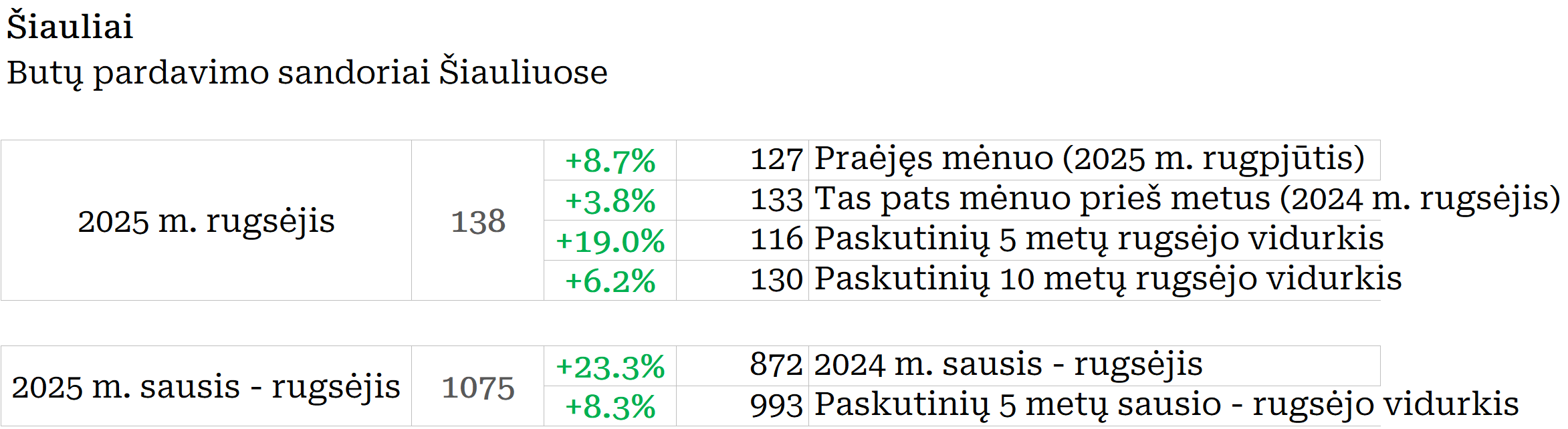 2025 m. rugsėjį Šiauliuose įregistruota 8,7% daugiau butų pardavimo sandorių nei prieš mėnesį, bei 3,8% daugiau nei 2024 metų rugsėjį. Paskutinių 12 mėnesių sandorių kiekio mėnesio vidurkis 2025 m. spalio pradžioje Šiauliuose siekė 118. Per mėnesį šis rodiklis ūgtelėjo 0,4%, o per metus 27,7%. Šių metų rugsėjis Šiauliuose buvo aktyvus – antras aktyviausias mėnuo šiais metais ir trečias pagal aktyvumą per paskutinius 36 mėnesius. Metinė butų sandorių skaičiaus dinamika kituose Lietuvos miestuose: Vilnius +31,6%, Kaunas +20,9%, Klaipėda +19,5%, Panevėžys +15,6%.
