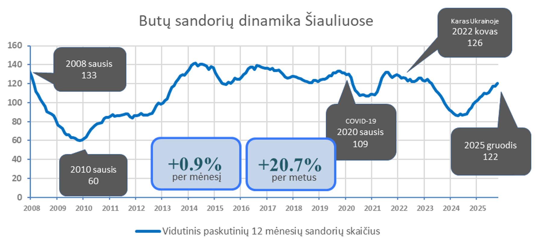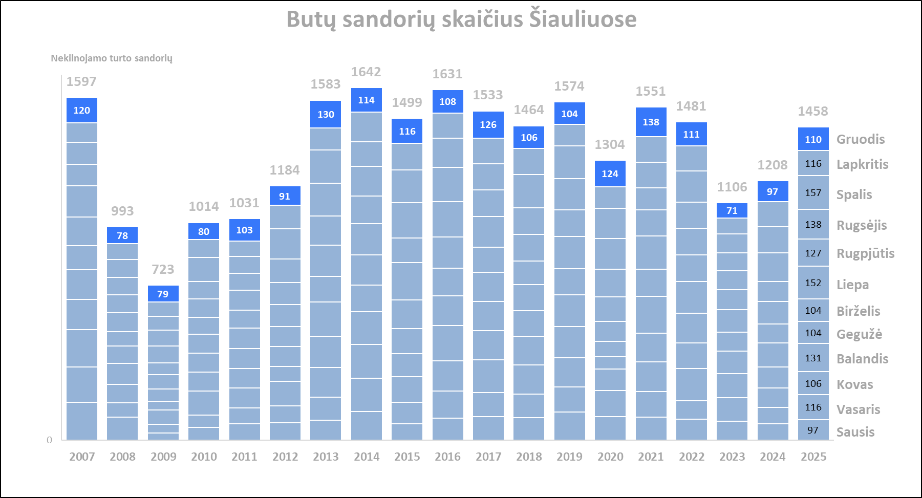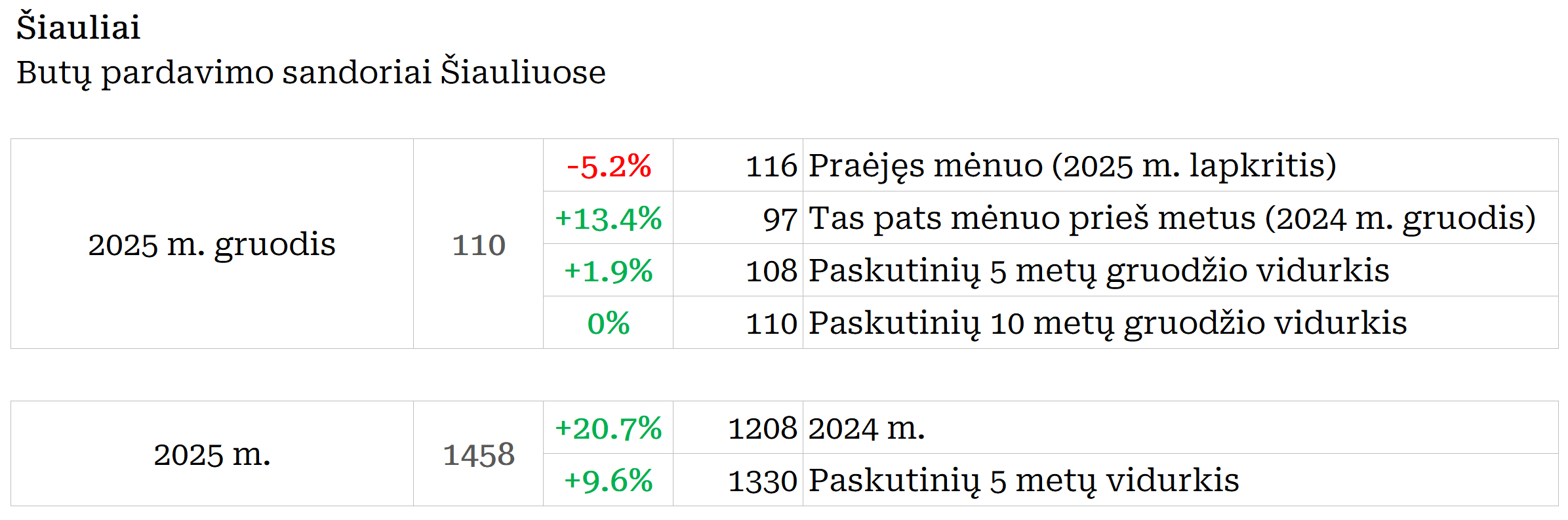 2025 m. gruodį Šiauliuose įregistruota 5,2% mažiau butų pardavimo sandorių nei prieš mėnesį, bei 13,4% daugiau nei 2024 metų gruodį. Paskutinių 12 mėnesių sandorių kiekio mėnesio vidurkis 2026 m. sausio pradžioje Šiauliuose siekė 122. Per mėnesį šis rodiklis augo 0,9%, o per metus +20,7%. 2025 metai Šiaulių butų rinkoje buvo aktyvūs – ne tik įregistruota 20,7% daugiau butų sandorių nei 2024 metais, bet ir 9,6% daugiau nei paskutinių 5 metų vidurkis. Metinė butų sandorių skaičiaus dinamika kituose Lietuvos miestuose: Vilnius +29,7%, Kaunas +14,4%, Klaipėda +16,2%, Panevėžys +11,3%.