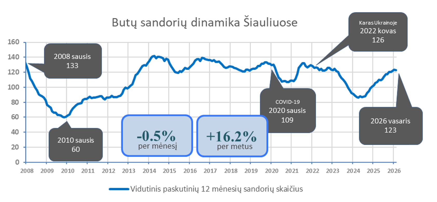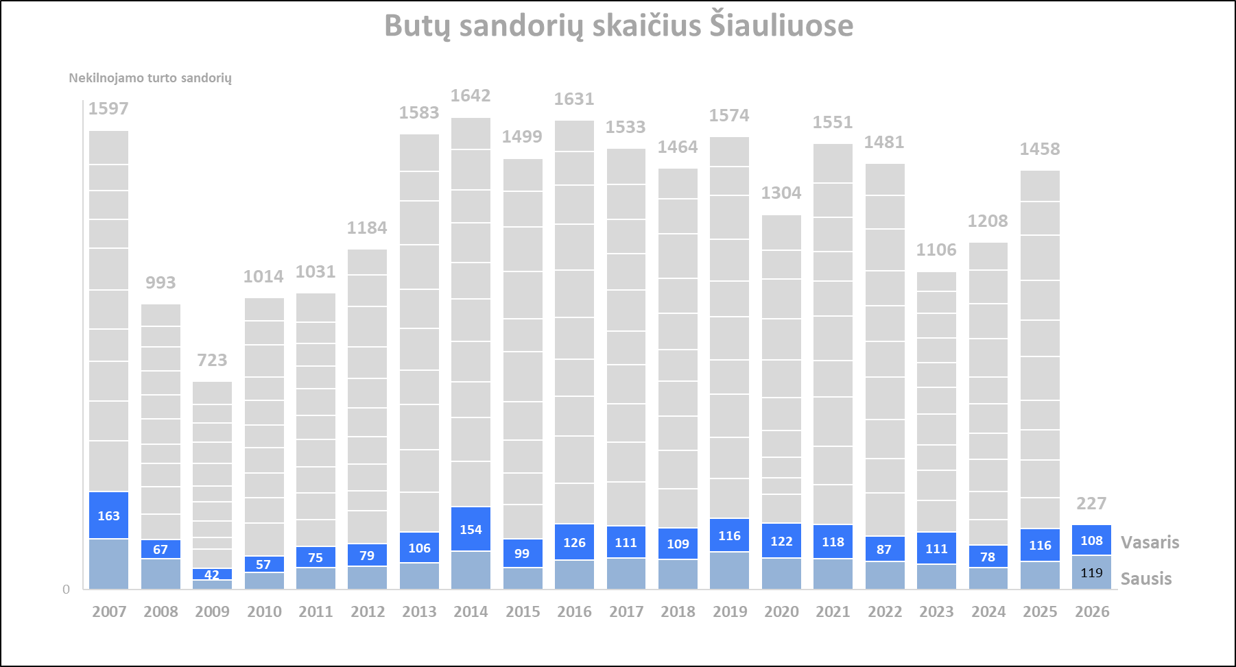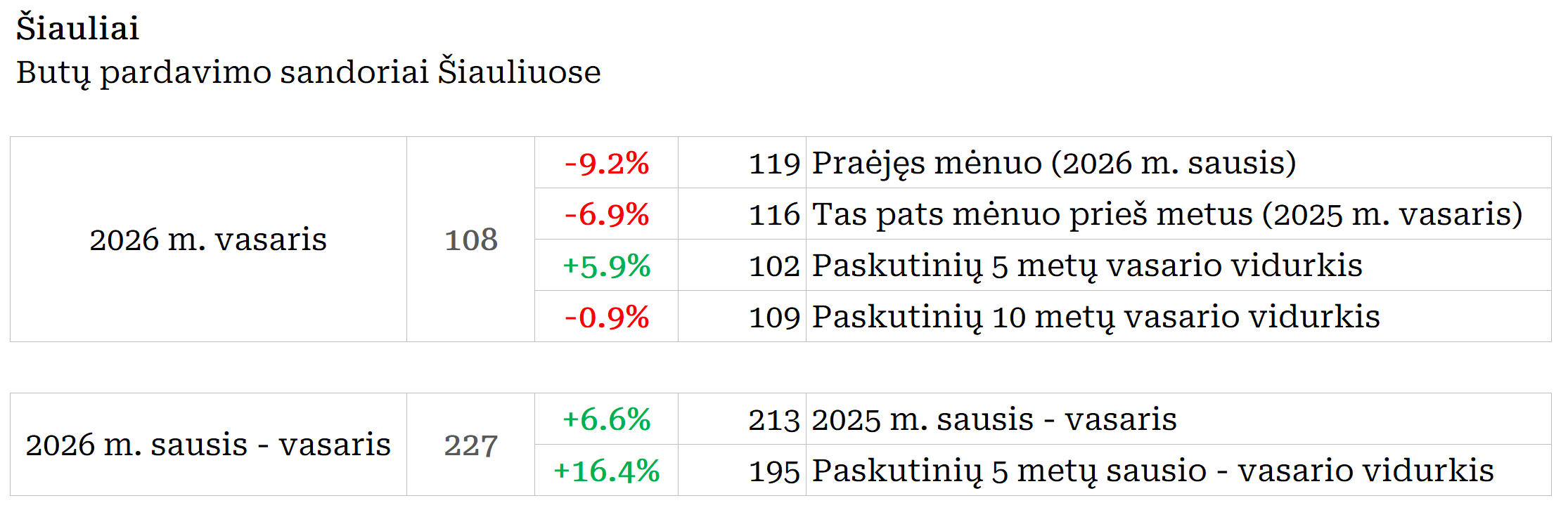 2026 m. vasarį Šiauliuose įregistruota 9,2% mažiau butų pardavimo sandorių nei prieš mėnesį, bei 6,9% mažiau nei 2025 metų vasarį. Paskutinių 12 mėnesių sandorių kiekio mėnesio vidurkis 2026 m. kovo pradžioje Šiauliuose siekė 123. Per mėnesį šis rodiklis traukėsi 0,5%, o per metus augo 16,2%. Nors šis vasaris pagal sandorių skaičių Šiauliuose nebuvo aktyvus, bet metų pradžios rezultatai vistiek 6,6% lenkia praėjusių metų pradžią. Metinė butų sandorių skaičiaus dinamika kituose Lietuvos miestuose: Vilnius +22,9%, Kaunas +9,8%, Klaipėda +12,8%, Panevėžys +6,9%.