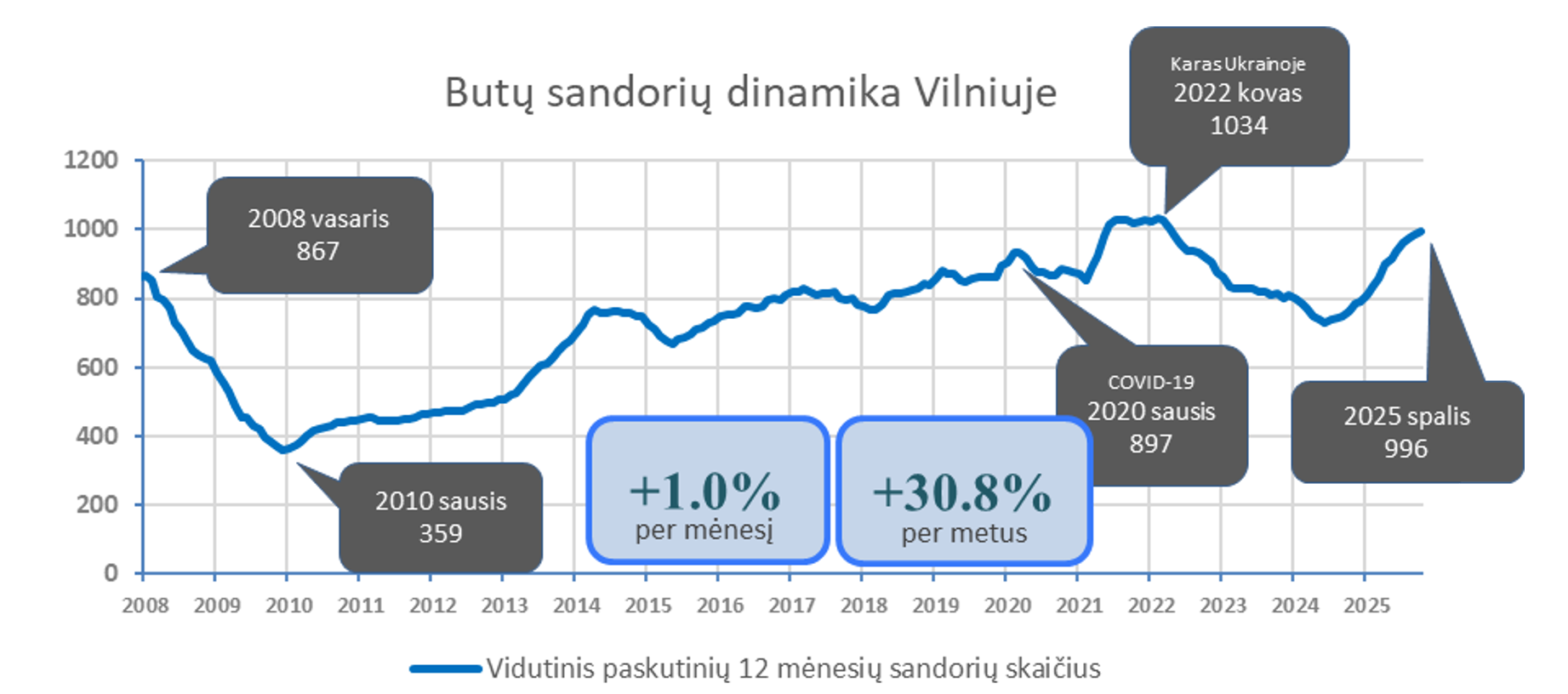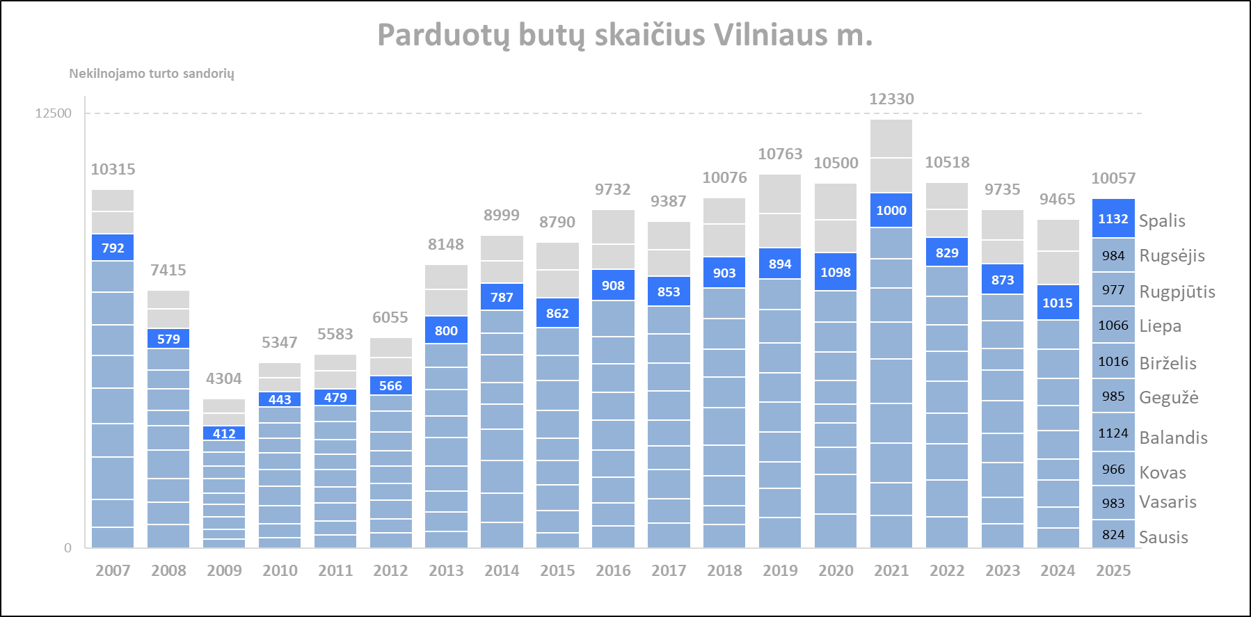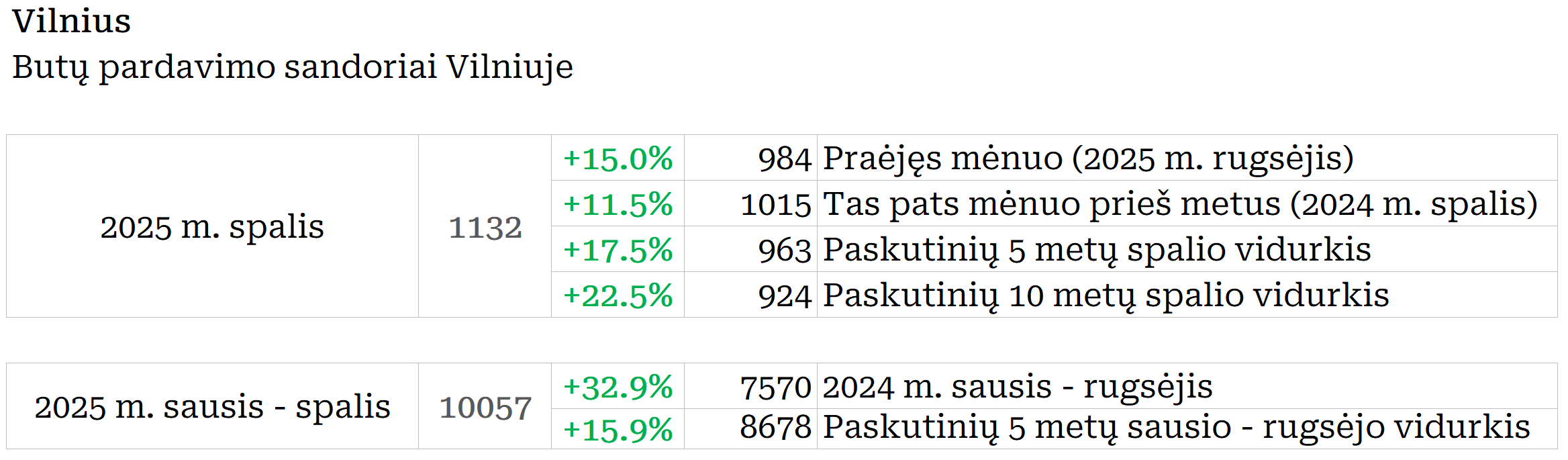 2025 m. spalį Vilniuje įregistruota 15,0% daugiau butų pardavimo sandorių nei prieš mėnesį, bei 11,5% daugiau nei 2024 metų spalį. Paskutinių 12 mėnesių sandorių kiekio mėnesinis vidurkis 2025 m. lapkričio pradžioje Vilniuje siekė 996. Per mėnesį jis paaugo 1,0%, o per metus +30,8%. Šių metų spalis – aktyviausias mėnuo per paskutinius 55 mėnesius. Metinė butų sandorių skaičiaus dinamika kituose Lietuvos miestuose: Kaunas +18,4%, Klaipėda +17,4%, Šiauliai +27,0%, Panevėžys +11,6%.