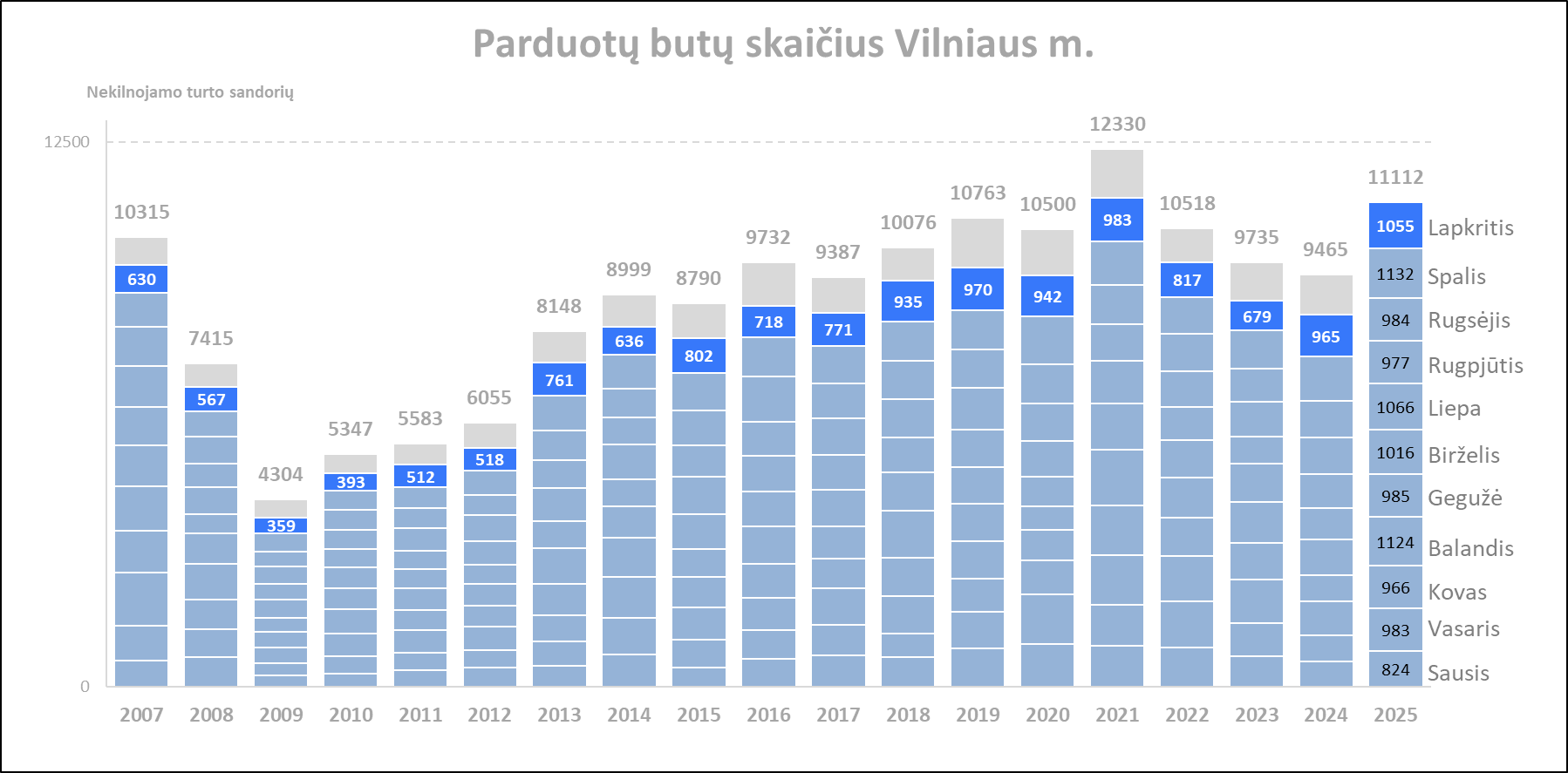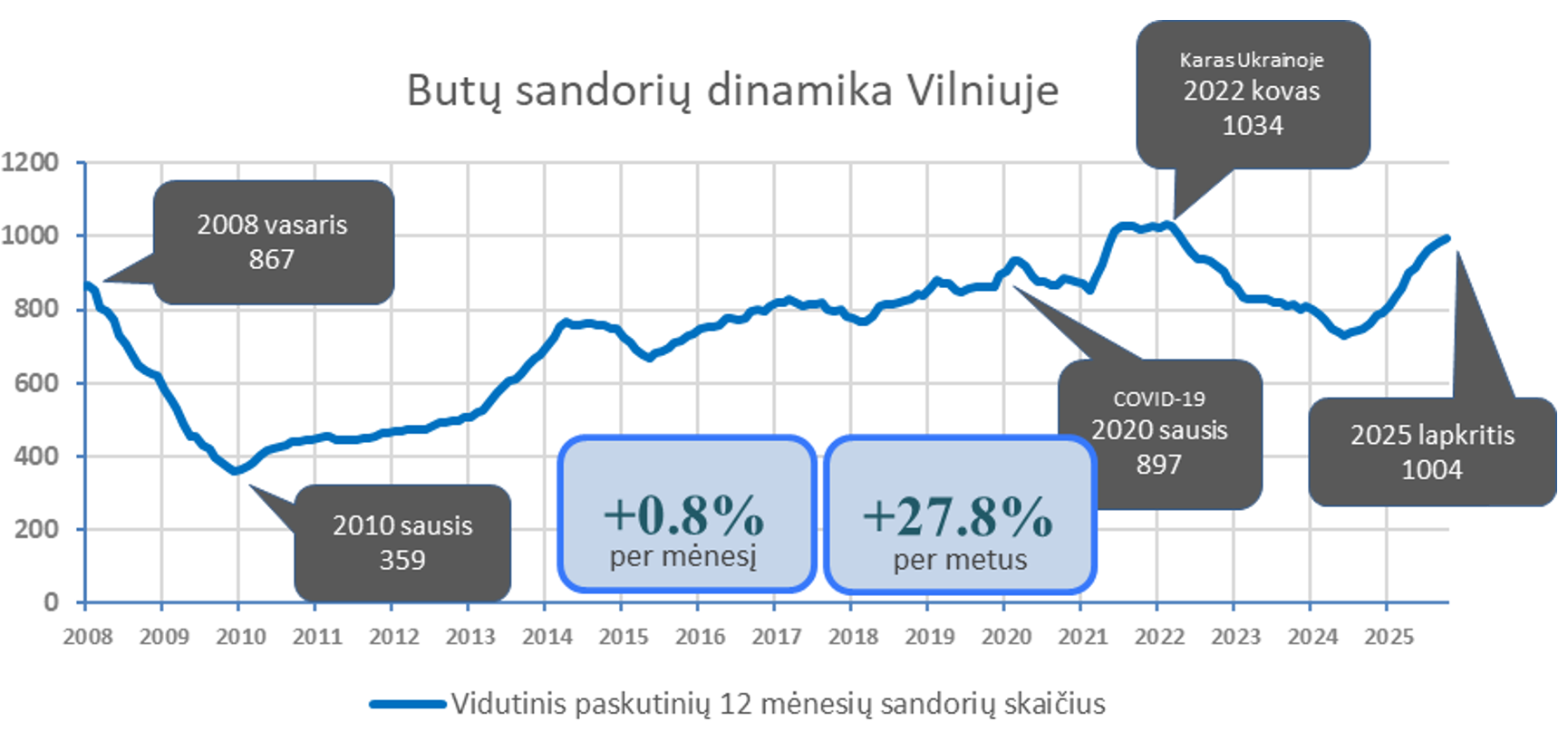 2025 m. lapkritį Vilniuje įregistruota 6,8% mažiau butų pardavimo sandorių nei prieš mėnesį, bei 9,3% daugiau nei 2024 metų lapkritį. Paskutinių 12 mėnesių sandorių kiekio mėnesinis vidurkis 2025 m. gruodžio pradžioje Vilniuje siekė 1004. Per mėnesį jis paaugo 0,8%, o per metus +27,8%. Šių metų lapkritis pagal sandorių skaičių aplenkė ne tik praėjusių metų lapkritį (+9.3%), bet ir ilgamečius lapkričio mėnesio vidurkius (+20.3%). Metinė butų sandorių skaičiaus dinamika kituose Lietuvos miestuose: Kaunas +15,6%, Klaipėda +14,4%, Šiauliai +22,3%, Panevėžys +9,6%.