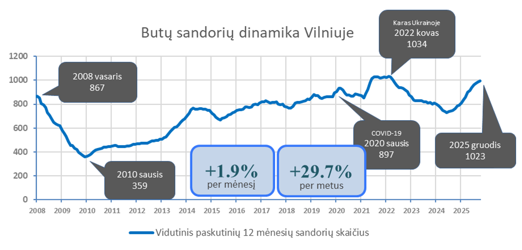 2025 m. gruodį Vilniuje įregistruota 10,0% daugiau butų pardavimo sandorių nei prieš mėnesį, bei 24,8% daugiau nei 2024 metų gruodį. Paskutinių 12 mėnesių sandorių kiekio mėnesinis vidurkis 2026 m. sausio pradžioje Vilniuje siekė 1023. Per mėnesį šis rodiklis augo 1,9%, o per metus +29,7%. 2025 metų gruodis pagal sandorių skaičių, kas yra nebūdinga gruodžiui, buvo pats aktyviausias mėnuo ne tik per visus 2025 metus, bet ir per paskutinius 55 mėnesius. Metinė butų sandorių skaičiaus dinamika kituose Lietuvos miestuose: Kaunas +14,4%, Klaipėda +16,2%, Šiauliai +20,7%, Panevėžys +11,3%.